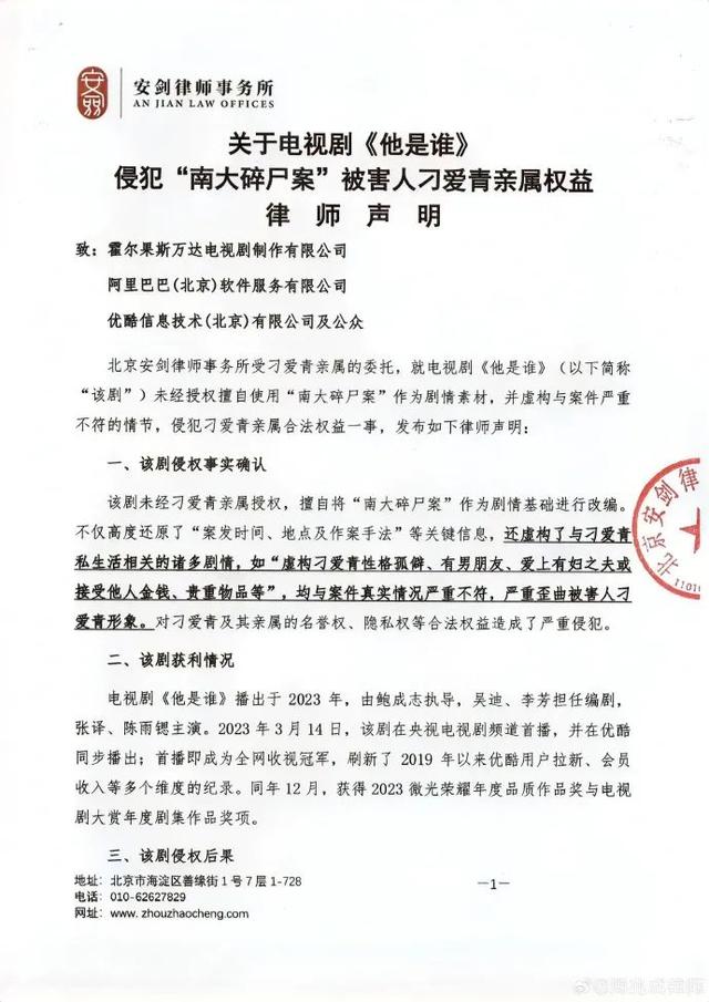 被害人家属:张译平白无故躺枪,我也很不好意思,我们想借助他的热度来维权 17日,刁爱青的姐夫告诉记者,2023年5月,他得知《他是谁》中有“南大碎尸案”的情节后专门去看了该剧。 他发现,剧中余爱芹案与妹妹被害案高度相似。电视剧播出之前,相关方没有与家属沟通,还虚构了“余爱芹出轨”的内容。 “张译平白无故躺枪,我也很不好意思,我们想借助他的热度来维权。”刁爱青的姐夫说,家属已不再要求精神赔偿,只希望出品方可以下架作品并道歉。 出品方:正与当事人律师协商 12月17日,万达电视剧公司回应闻记者称,《他是谁》是万达电视剧联合出品的项目,于2022年完成立项、备案与拍摄,最终在2023年3月播出。今年4月,万达电视剧方面接到法院送达的起诉状等资料。在法院组织协调下,目前公司积极与当事人律师进行沟通。万达方面表示,充分理解当事人心情,高度重视当事人诉求。目前正与当事人律师在法院组织协调下持续就相关内容进行协商。 律师说法:影视作品对真人真事改编时,添加虚假信息或涉侵犯名誉权 北京京本律师事务所主任连大有律师: 根据《民法典》第1024条和1032条,民事主体都享有名誉权和隐私权。影视作品在对真人真事改编时,如果加入一些与事实不符的虚构情节,导致公众对原型人物的认识、评价出现偏差,甚至朝向不好的方向发展,那么这种改编可能构成对原型人物名誉权的侵犯。 北京伟睿律师事务所林虎才律师: 这个案件应属于名誉权纠纷,侵犯名誉权需要有行为导致当事人名誉受到损害,如侮辱诽谤、恶意中伤、虚假信息等。这类案件认定侵权比较有难度,法院组织双方调解是可以理解的正常做法。 警方誓言追凶到底 公开资料显示,“南大碎尸案”案发于1996年,南京大学成人教育学院一年级女学生刁爱青,在校期间被凶手残忍杀害,尸体被一名清洁工发现。 该案多年来未曾侦破,2016年1月,公安部刑侦局官方微博辟谣该案超过追诉期,称警方必将依法追查到底,绝不放弃。