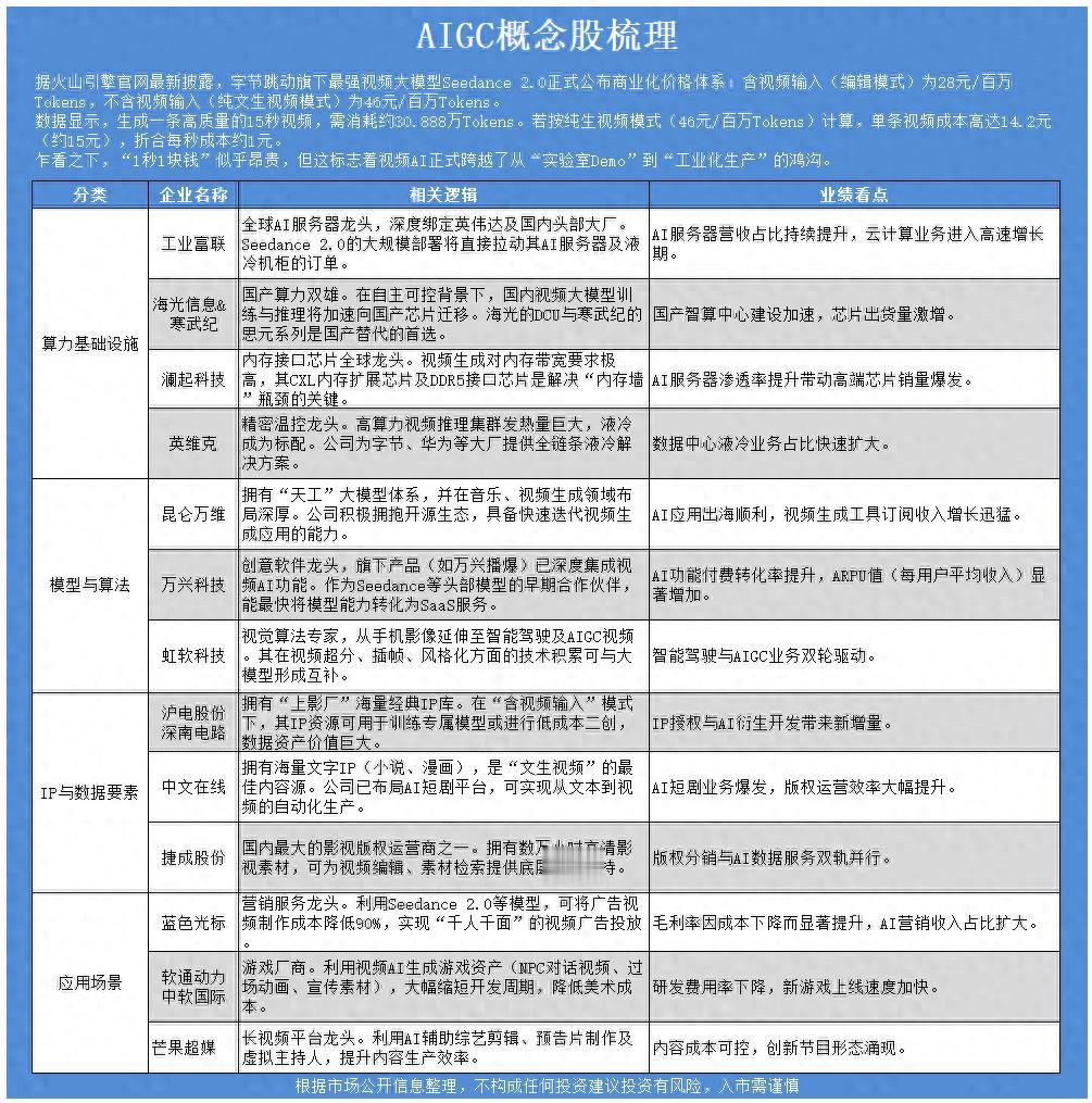 性价比革命:相比2024-2025年早期模型动辄数百元一条且画质不稳的成本,Seedance 2.0以电影级画质、物理规律精准度及可控性,将成本压缩至影视制作成本的千分之一。商业模式闭环:对于短剧制作、广告营销、游戏资产生成等B端客户,15元生成一条无需演员、场地、后期剪辑的商用级视频,意味着生产效率提升百倍,成本降低90%以上。算力需求爆发:纯生视频模式的高溢价(46元 vs 28元)揭示了其背后巨大的算力消耗。视频生成正成为继大语言模型之后,驱动GPU算力、高带宽存储(HBM)及液冷基础设施的第二增长曲线。Seedance 2.0的定价策略不仅确立了行业标杆,也或是AIGC视频应用大规模落地一个时代缩影。