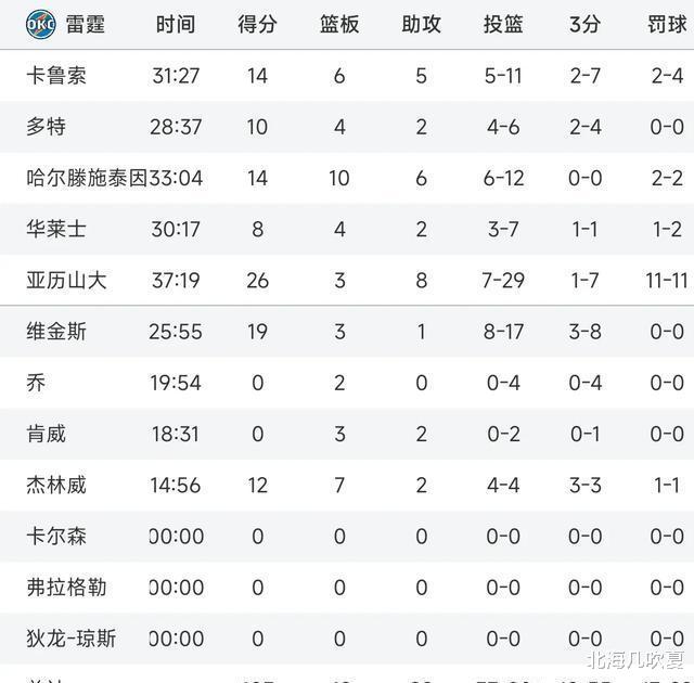雷霆队这边,亚历山大贡献了26分,全队其他数据后面会详细列出。
