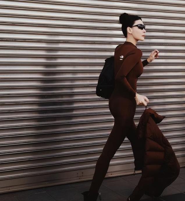 照片中的她站在机场旁边,身穿咖色紧身衣、紧身裤。
