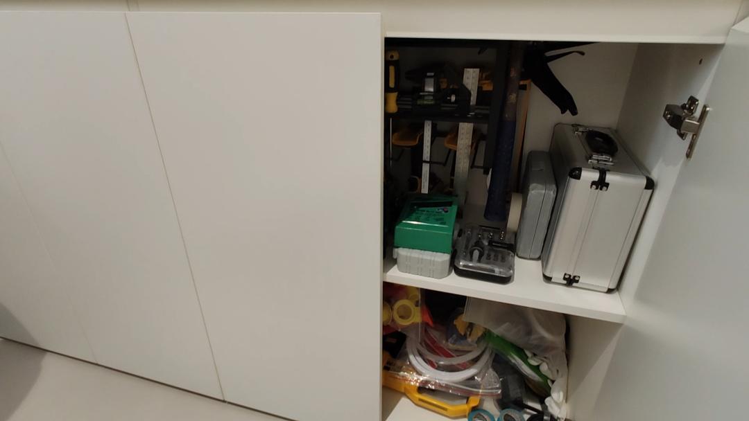 建议:买一个小工具箱,各种工具齐全,再做一个专门收纳工具箱与五金的规格,避免急需时翻箱倒柜。