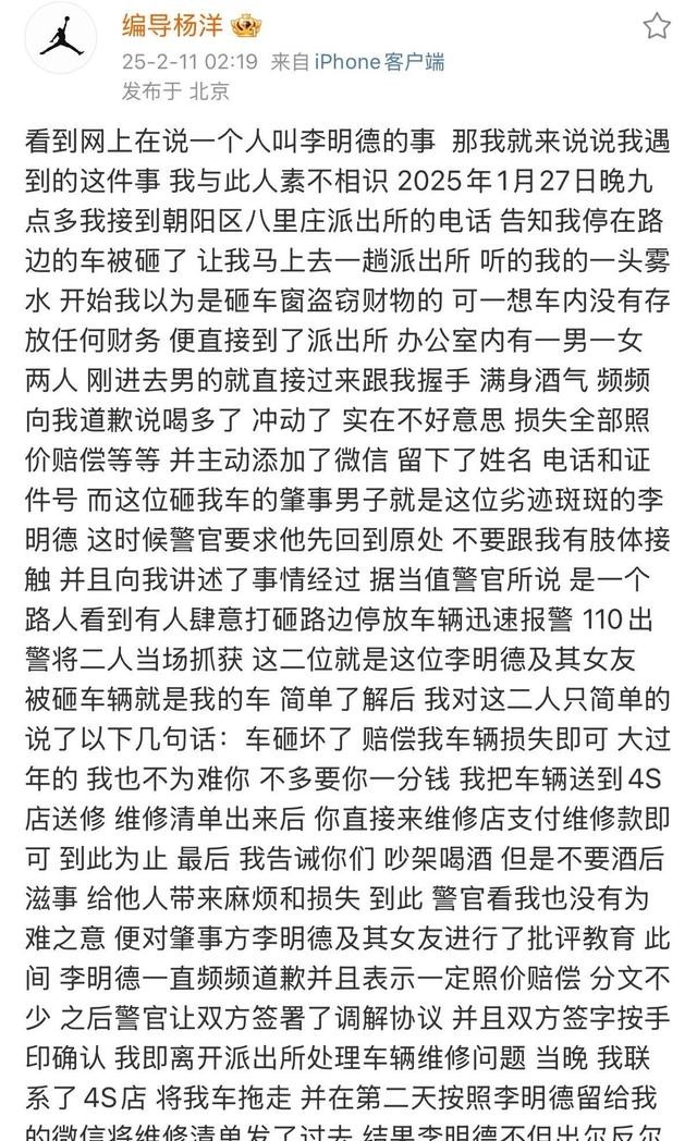 在前女友出面发声之后,被砸车的人也出面发声,表示自己当时也是一头雾水,他与李明德素不相识,却在今年1月27日被李明德砸了车,而当时他到派出所,李明德先是态度很好的表示赔偿,可离开派出所后,李明德就出尔反尔了。