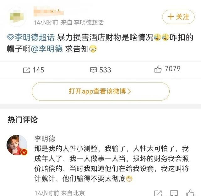 李明德甚至将自己打砸酒店财物这一行为,表示是自己对剧组的“人性小测试”,言外之意就是剧组借着他这一行为,辞退了他,难道剧组人员是抓着他的手让他打砸财物的吗?谎话连篇,荒谬至极,可偏偏有人相信。