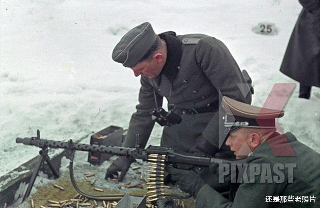 德军正在使用MG-34通用机枪进行射击。MG-34通用机枪,是世界上第一种通用机枪,在1935年开始装备德国部队,该机枪口径为7.92x57毫米(又名8毫米毛瑟弹)。由于一战后的德国受到凡尔赛条约所限制而不能制造重型武器,因此MG34在德军中定位为轻重两用机枪 。