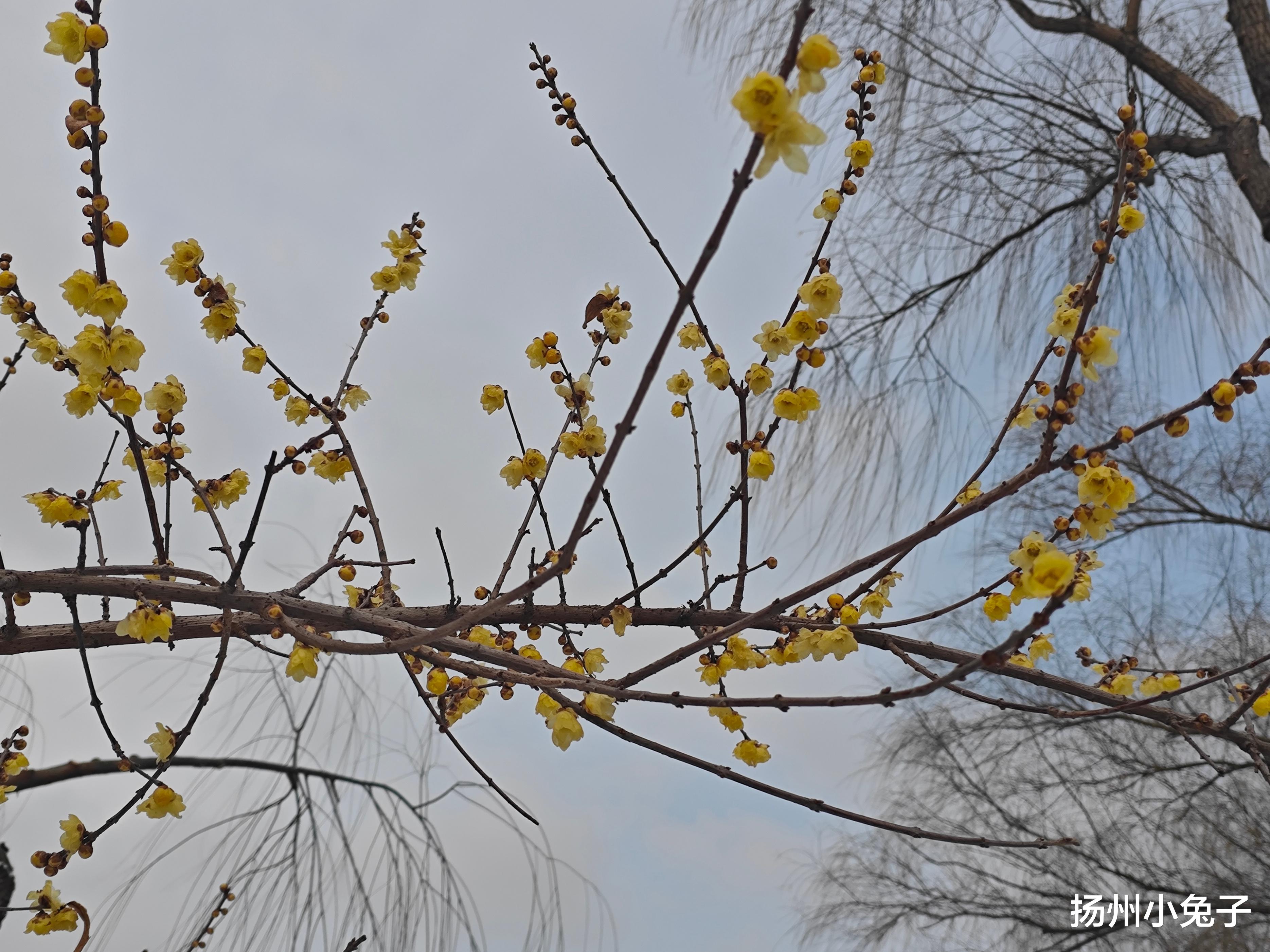 在海棠门两边各留了一张照片。去看腊梅。“众芳摇落独鲜妍,占尽风情向小园”。假如将瘦西湖分割成一个个独立的园林,静香书屋无疑是其中最出色的一个。一条溪水将它与红尘隔开。园中独具特色的设计,园后成片的腊梅,是最好的陪伴也是最佳的提醒。此刻,“玉尘压得梅腰折,犹送清香过短墙”的诗句,恰到好处地描绘出这里的场景。