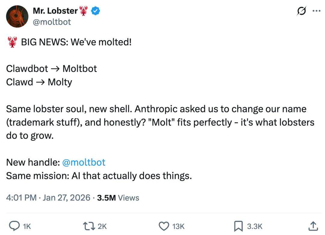 这个智能体助手是真的能帮你干活,它已经引走了 AI 圈的大半注意力。甚至因为太火被 Anthropic 指控商标侵权,Clawdbot 已经改名为「Moltbot」。