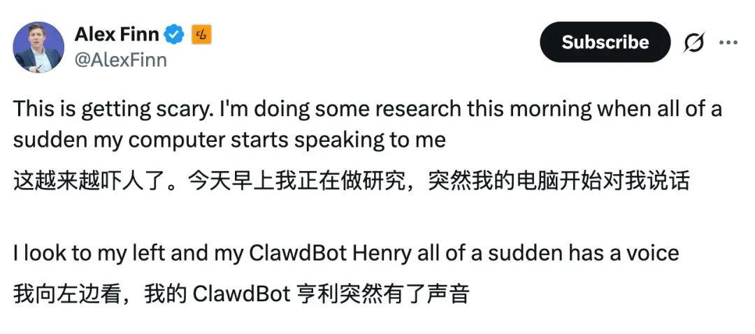 AI 创作平台的创始人 Alex Finn 就遇到了「开口说话」的 Clawdbot。