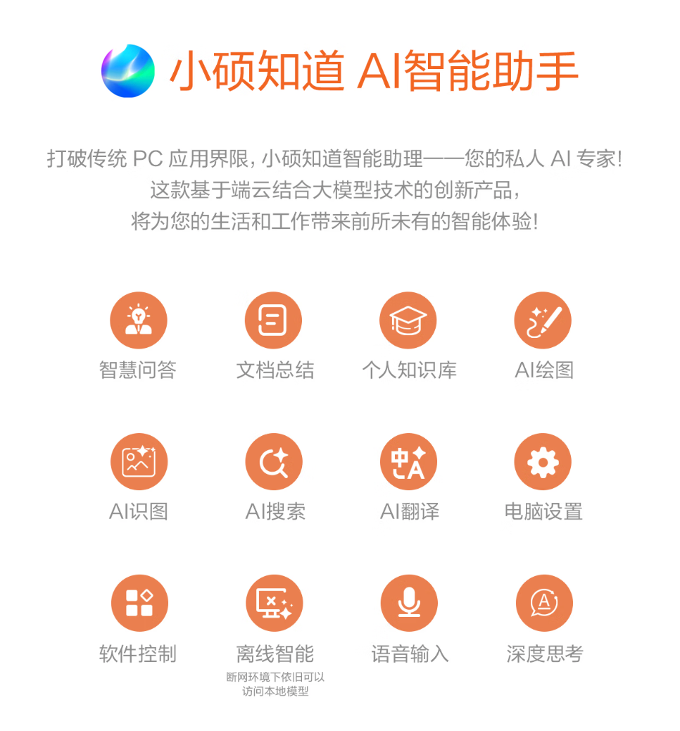 搭配“小硕知道”AI智能助手,华硕无畏Pro14 2026的AI体验更上一层楼。端云一体AI大模型打破网络限制,即便身处户外弱网/无网环境,也能依托本地模型实现离线推理。支持智慧问答、文档总结、个人知识库、AI绘图、AI识图、AI搜索、AI翻译、电脑设置、软件控制、语音输入等丰富功能,覆盖办公创作全流程,无论是快速生成文案、优化设计草图,还是通过语音指令调节屏幕亮度、打开办公软件,都能一键直达,让高效办公成为常态。除此之外,它还能随时化身贴心伙伴,陪你闲聊解闷。
