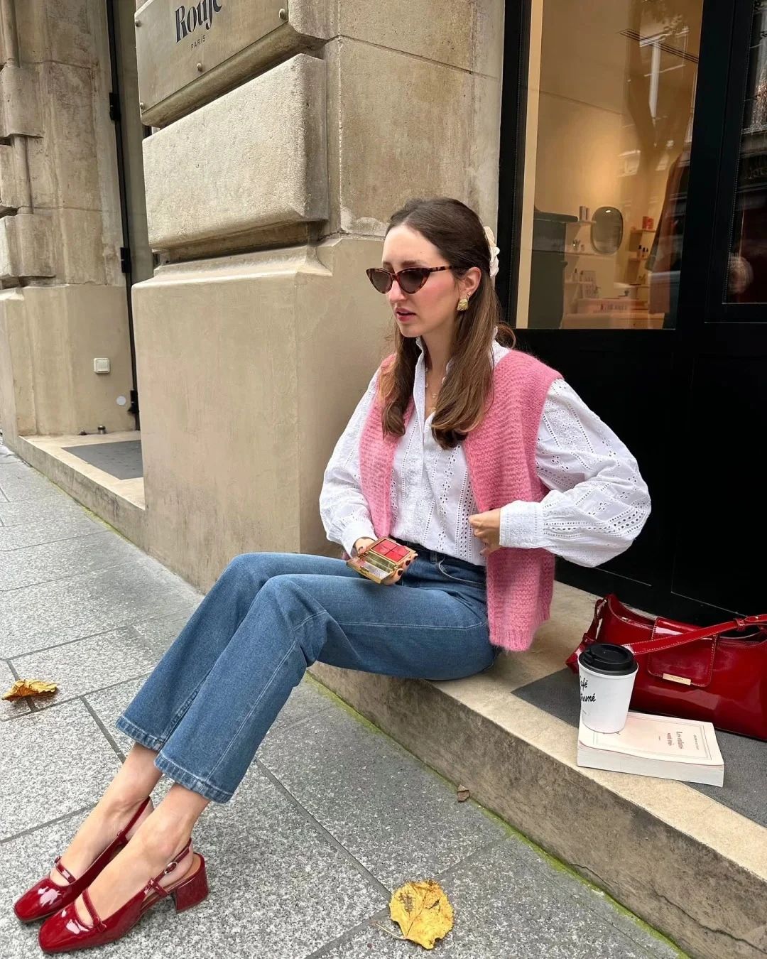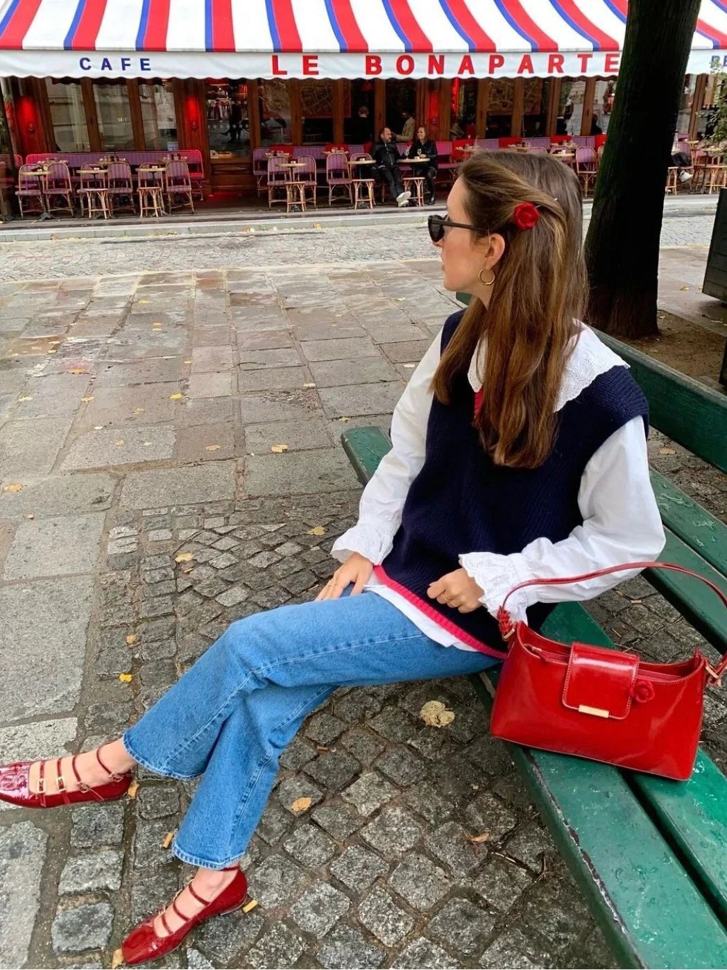 将红色毛衣作为披肩搭在肩上,与红色发饰和玛丽珍鞋形成呼应,既富有创意又极具时尚感,能够瞬间提升整体造型的亮点。