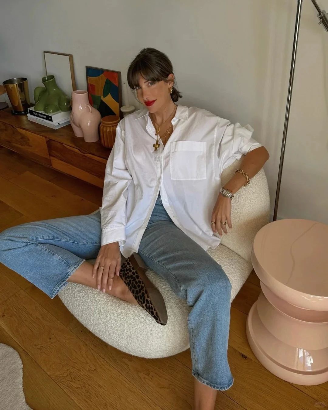 豹纹衬衫搭配蓝牛仔裤是一种充满野性与时尚的组合,而加入一双粉色袜子和黑色乐福鞋,则能为整体造型增添几分趣味性和个性。