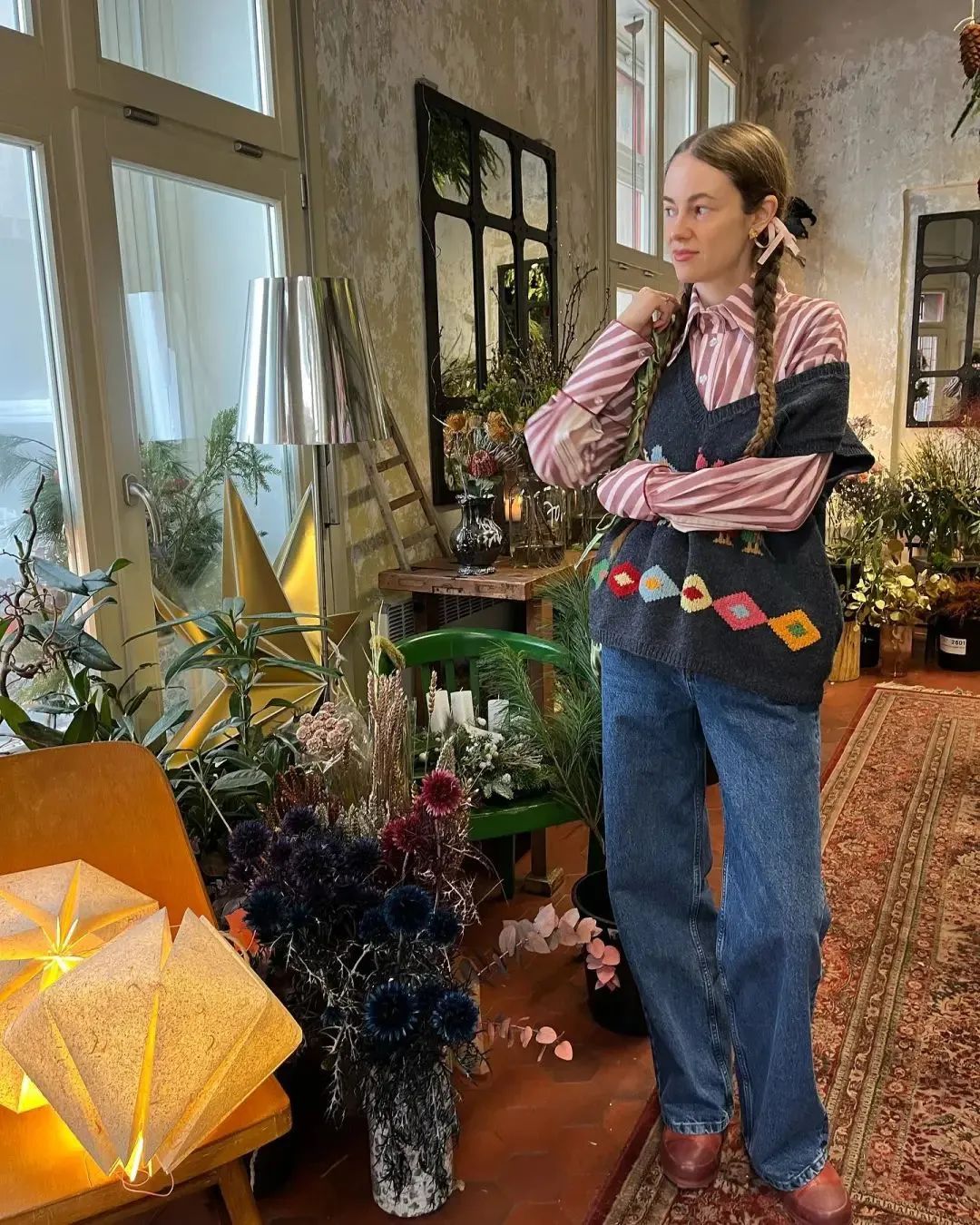 粉白条纹毛衣叠穿藏蓝色毛衣马甲,与蓝牛仔阔腿裤呼应起来