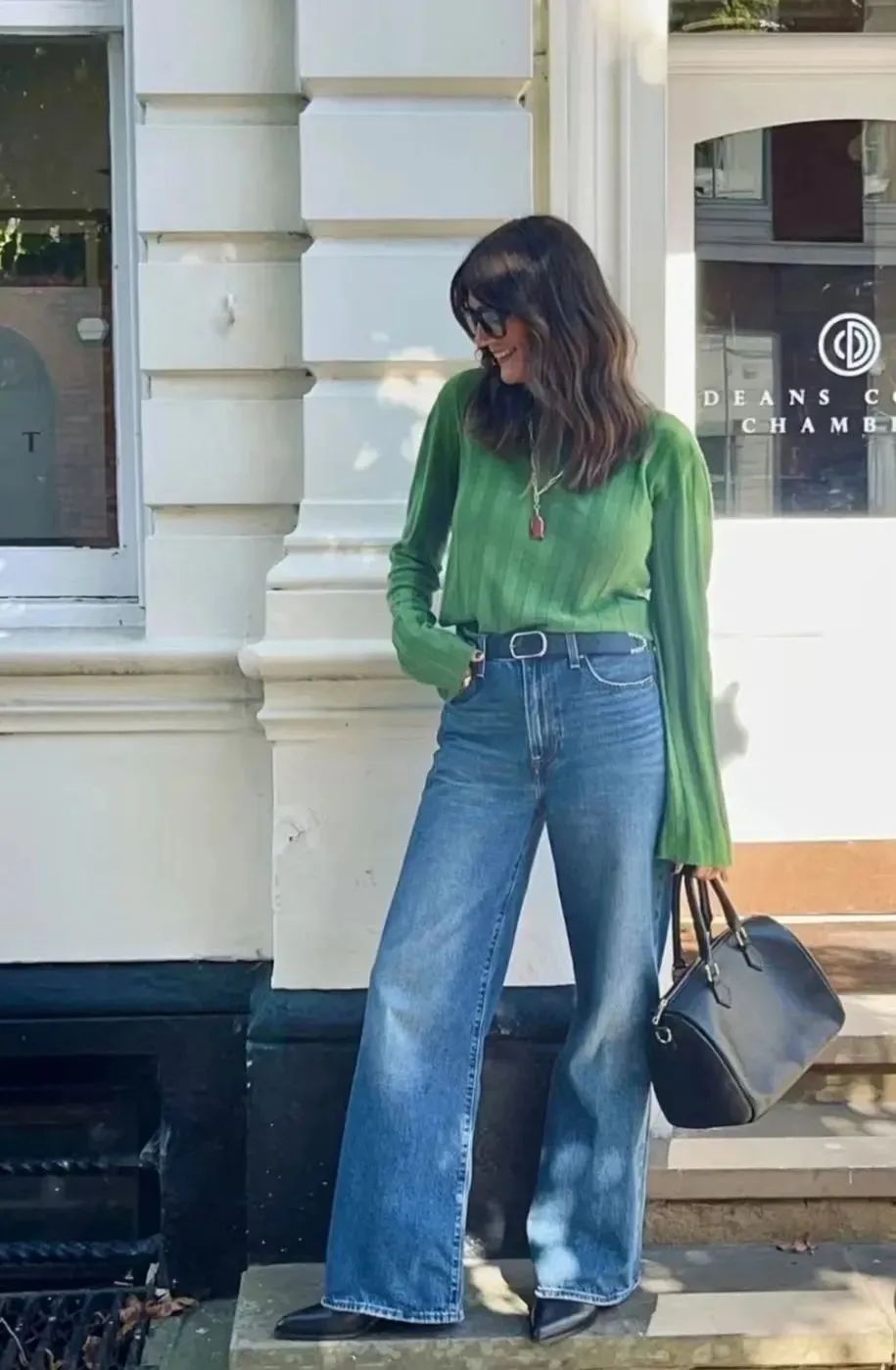 绿色毛衣搭配牛仔阔腿裤,再配上一条黑色腰带,不仅能够突出腰线,还能为整体穿搭增添几分时尚感。