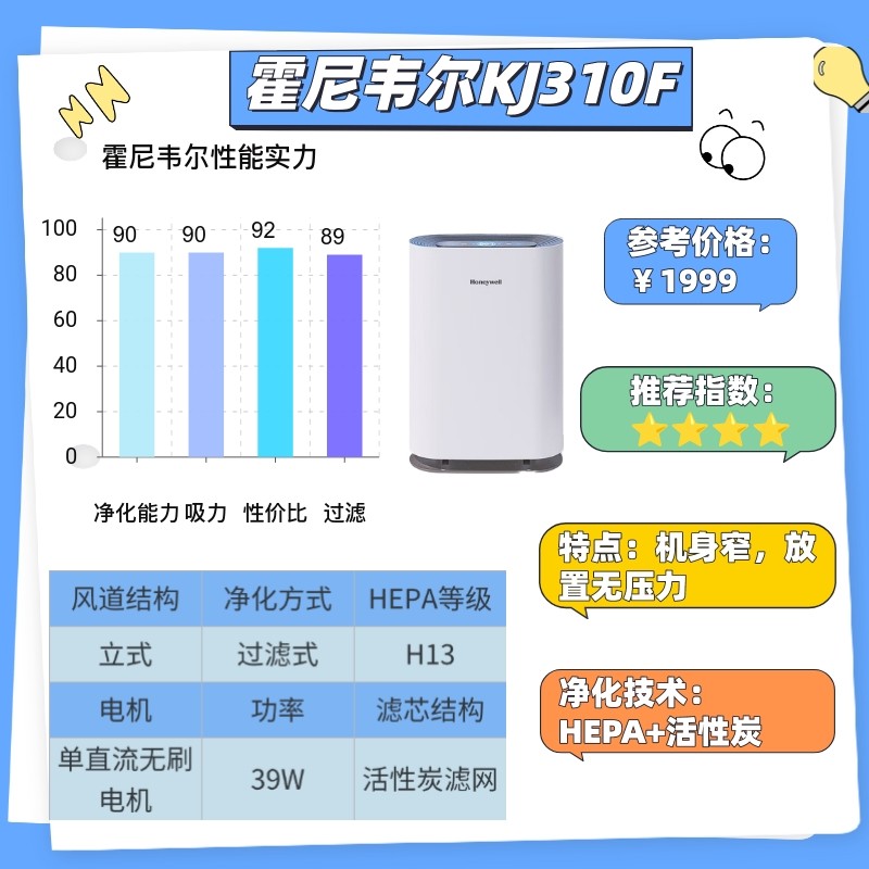 霍尼韦尔KJ310F霍尼韦尔KJ310F的体量介于两者之间,正面覆盖面积约为 A4 纸的 70%。整体尺寸比美的小一圈,但仍然需要占用固定地面位置。放在卧室或书房时,需要提前规划摆放点位,否则容易产生压迫感。适合中等空间,但在紧凑环境中灵活性有限。