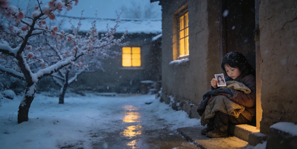 雪越下越大,覆盖了院子里的桃树,覆盖了门前的山路,也覆盖了这个小女孩小小的身影。她蜷缩在门槛上,渐渐失去了意识,手里依旧紧紧攥着那张合影,怀里抱着奶奶的旧棉袄,嘴角带着一丝微弱的笑意,仿佛在梦里,她终于等到了父母回来,等到了奶奶醒来,一家人围在一起,吃着桃树结的果子,温暖而幸福。