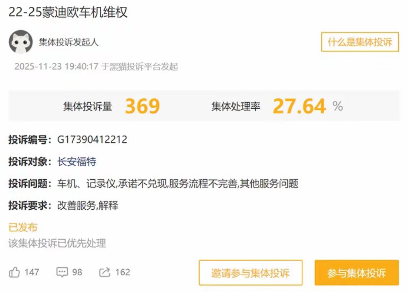 截至2025年12月初,部分第三方平台信息显示,超过360名2022-2025款蒙迪欧车主在投诉平台发起集体投诉,核心诉求直指老款车机系统严重卡顿问题。