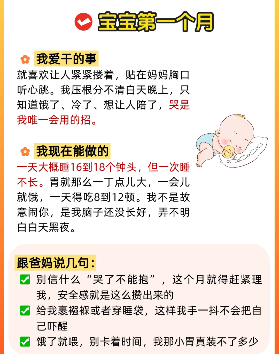刚出生的那几天,宝宝大部分时间都在昏昏沉沉地睡。他不是在偷懒,而是在努力适应有光、有声、有温度的世界。这时候他心里想的最多的就是“好饿”和“好怕”,所以只要闻到奶香、听到妈妈的心跳,就能瞬间安静下来。