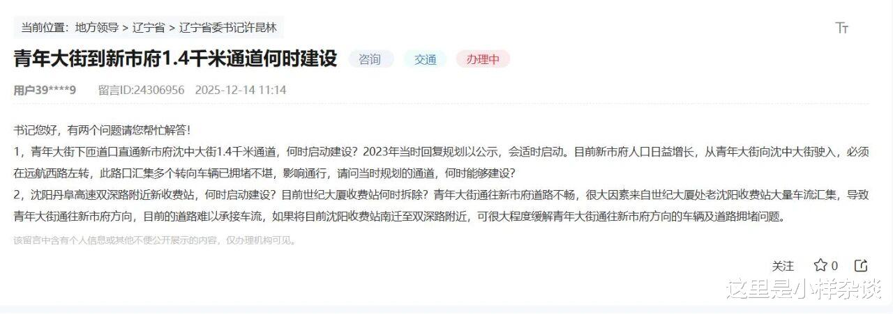 具体内容如下:1,青年大街下匝道口直通新市府沈中大街1.4千米通道,何时启动建设?2023年当时回复规划已公示,会适时启动。目前新市府人口日益增长,从青年大街向沈中大街驶入,必须在远航西路左转,此路口汇集多个转向车辆已拥堵不堪,影响通行,请问当时规划的通道,何时能够建设?2,沈阳丹阜高速双深路附近新收费站,何时启动建设?目前世纪大厦收费站何时拆除?青年大街通往新市府道路不畅,很大因素来自世纪大厦处老沈阳收费站大量车流汇集,导致青年大街通往新市府方向,目前的道路难以承接车流,如果将目前沈阳收费站南迁至双深路附近,可很大程度缓解青年大街通往新市府方向的车辆及道路拥堵问题。这条高速给很多人带来了方便,去机场和本溪、丹东非常方便,但是也让新市府的居民多了点麻烦,地铁近在咫尺又遥不可及,再比如这个快速通道也不知道何时能修。