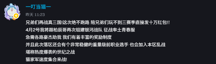 兄弟们,我忍不住要吐槽了!昨晚刷手机时看到一叮当猫一这个UP主的动态,直接就绷不住了。这货在那里嚷嚷着"陪兄弟们玩不到三赛季直接发十万红包!!",然后还说什么4月2号要跟柏辰哥组建银河战队征战率土青春服。