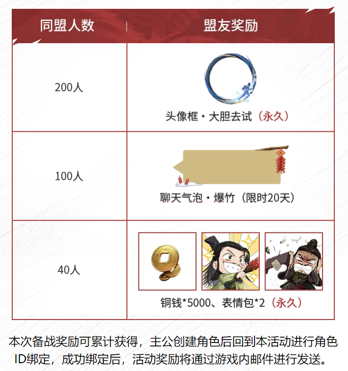 如果说前面的赠送武将活动是为我们的霸业打下地基,那么备战盟活动就是为我们的游戏体验添砖加瓦,当一个同盟的预约人数到达指定量级后,我们就将获得额外的游戏福利,其中可是包含永久装扮以及最为重要的战法升级所需要的铜币。