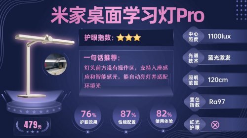 护眼台灯哪种好?米家桌面学习灯Pro有着52cm的大光源面,照明范围约1.2米,中心照度达1100Lux,日常读写光线基本够用。显色指数Ra97,色彩还原比较真实。操作上支持入座感应,人一坐下就亮灯,还有智能感光,能跟着环境光自动调亮度。操作按钮在灯头前方,还能连米家APP或者用语音助手控制,远程调节、场景联动都挺方便。不过,它是直发光设计,光线有点集中,近距离用或者直视灯珠,会觉得刺眼,对光线敏感的人得调整下角度,别直视。