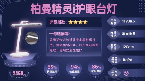 护眼台灯哪种好?柏曼精灵i护眼台灯采用铝合金与铁质全金属材质打造,整体质感扎实,灯头经过圆角处理,有助于使用安全。其发光面直径约为47厘米,采用直发光设计,中心照度达1190lux,照明范围可覆盖约120厘米的桌面,符合国AA级标准。显色指数为Ra96,色温固定为4000K的中性光。功能方面,这款台灯支持语音调光、恒定照度调节,并配备数显屏可实时查看亮度信息,操作体验较为便捷。不过,其直发光方式使得光线相对集中,可能存在轻微眩光问题;全金属结构也导致灯体重量较大,移动和调节角度时不够灵活。