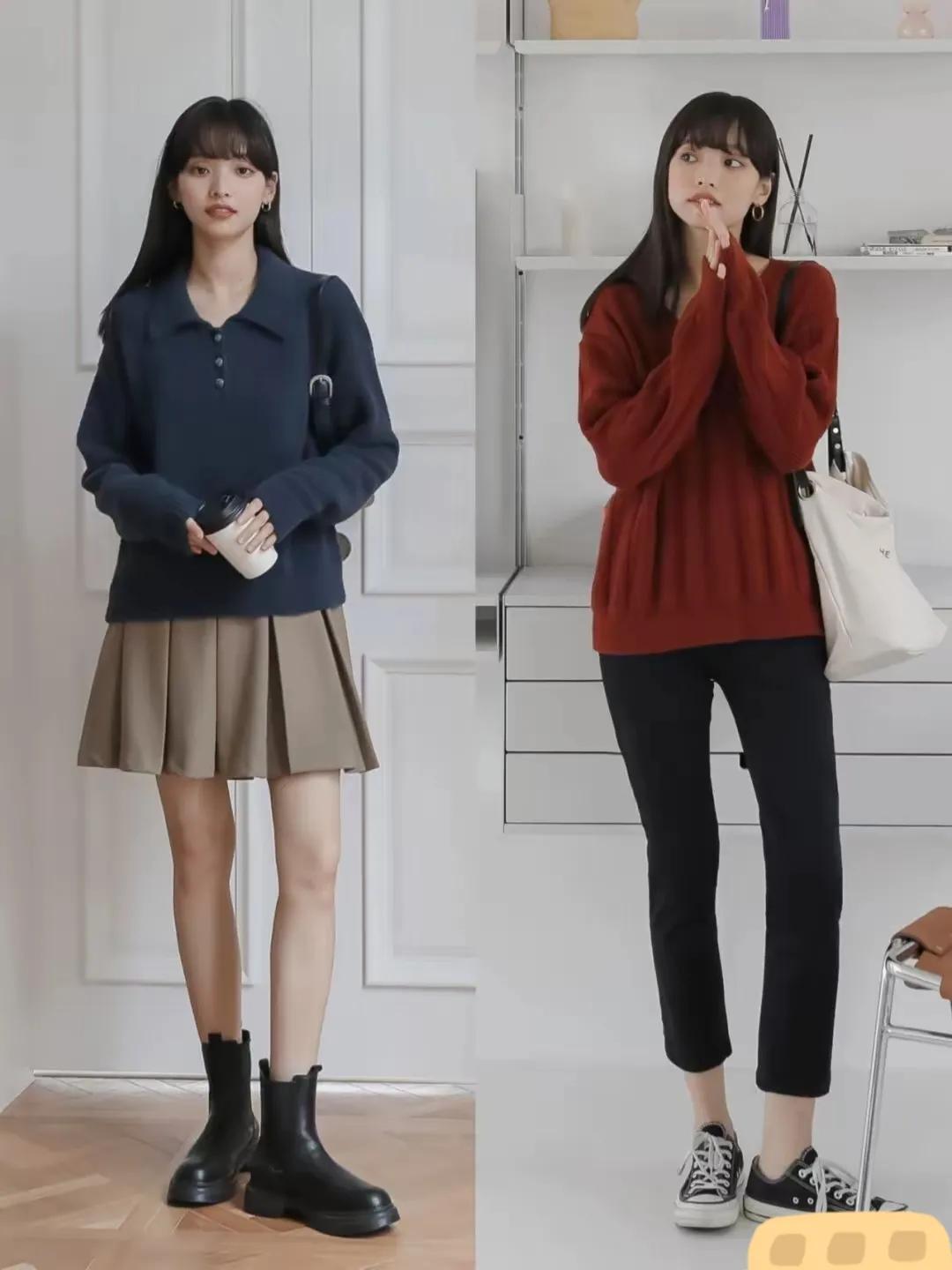 对于小个子女生来说,针织衫搭配半身裙是一种技能,展现温柔和既姿又能优化身材比例的穿搭方式,如果想要更个性,我们在鞋子上也可以下足功夫,例如我们选择皮质的单鞋,马丁靴来搭配,这样能影响你整套创意造型的穿衣风格走向。
