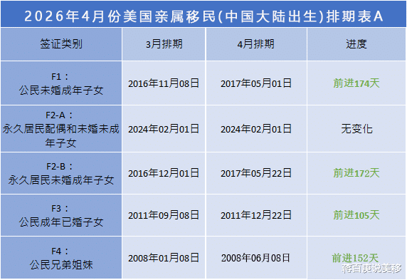 具体来看中国大陆地区亲属移民排期细节:F1类(美国公民21岁以上未婚子女)表A前进174天,更新至2017年5月1日;F2B类(绿卡持有者21岁以上未婚子女)表A前进172天,定格于2017年5月22日;F3类(美国公民已婚子女)表A前进105天,来到2011年12月22日;F4类(美国成年公民兄弟姐妹)表A前进152天,更新为2008年6月8日。