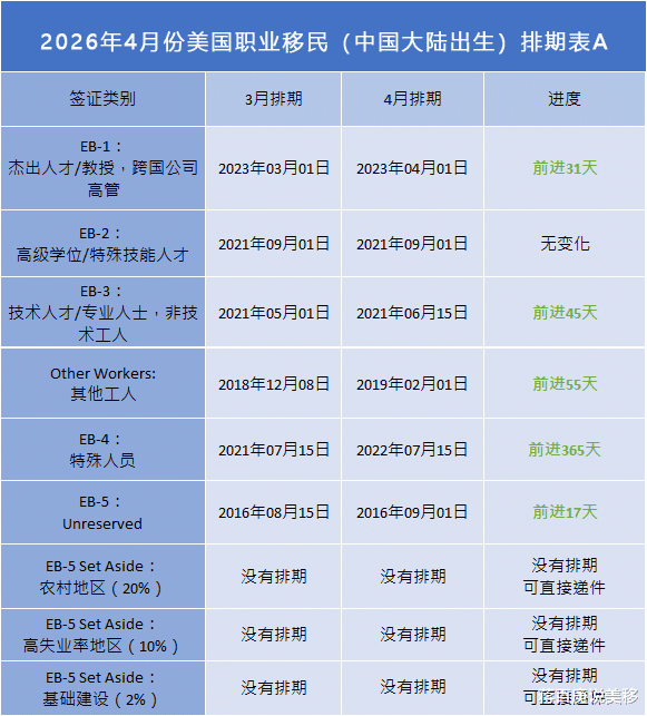 在职业移民排期方面,4月份表A同样呈现积极信号:EB-1类(杰出人才、跨国高管等)中国大陆出生申请人排期,继上月前进28天后,本月再推31天,更新至2023年4月1日。连续两个月稳步推进,既体现出美国移民局本财年(2026财年)积压案件处理效率的提升,也反映出本财年签证配额相对充裕。此外,另一排期大户印度的EB-1类排期同步前进至2023年4月1日,全球其他国家及地区则持续保持无排期状态。