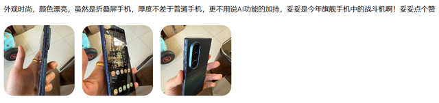 当然,超轻薄机身并不意味着三星Galaxy Z Fold7在其他方面做出了妥协。“屏幕显示细腻流畅,性能强悍无卡顿,拍照效果媲美单反,续航快充给力,系统交互智能便捷”“2亿像素主摄成像细腻,8英寸大屏办公娱乐两相宜,AI功能智能高效,性能强劲流畅”等评价就印证了这点。