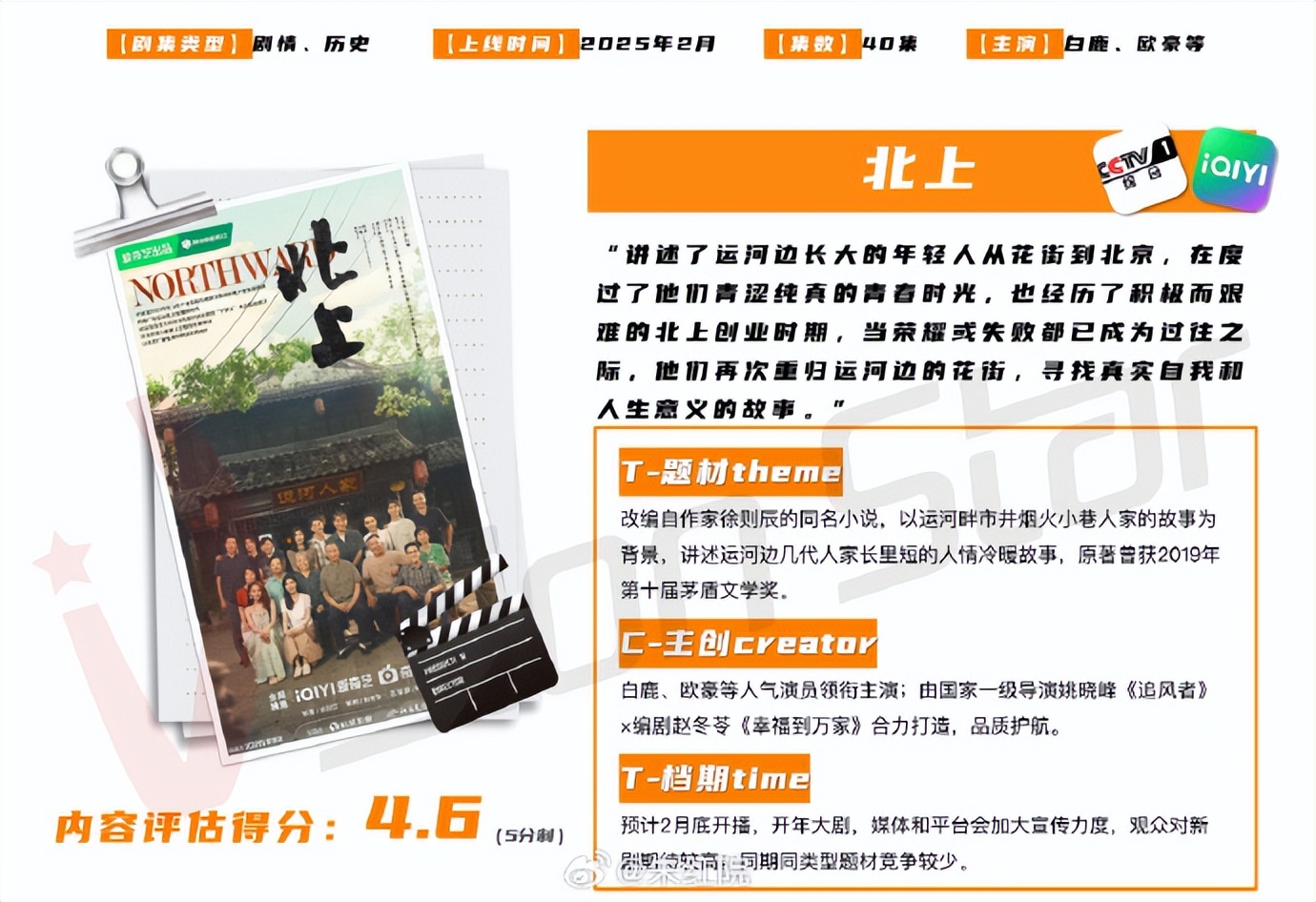 白鹿、欧豪主演的《北上》暂定3月3日央一黄金档、爱奇艺播出。