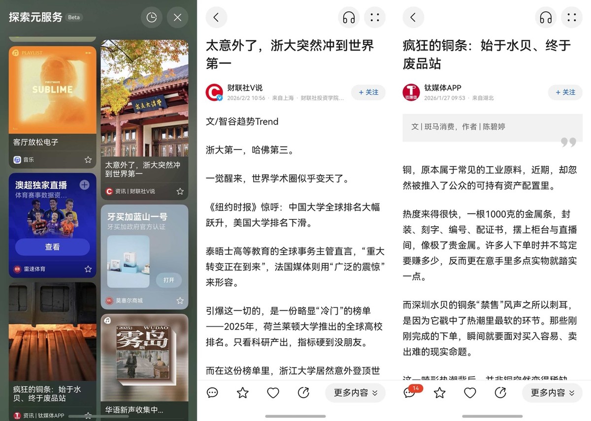 上车坐定,咖啡喝完,真正的“无聊大挑战”才刚开始。再次滑进“探索元服务”,漫无目的地接着浏览起来。系统给我推了“财联社V说”的资讯卡片,讲的是浙大学术排名,内容挺扎实;再往下划,又看到“钛媒体APP”的深度分析,讲的是铜条价格的疯狂波动。这些内容质量挺高,正好能让我静下心来看看,缓解了刚上车时的心浮气躁。