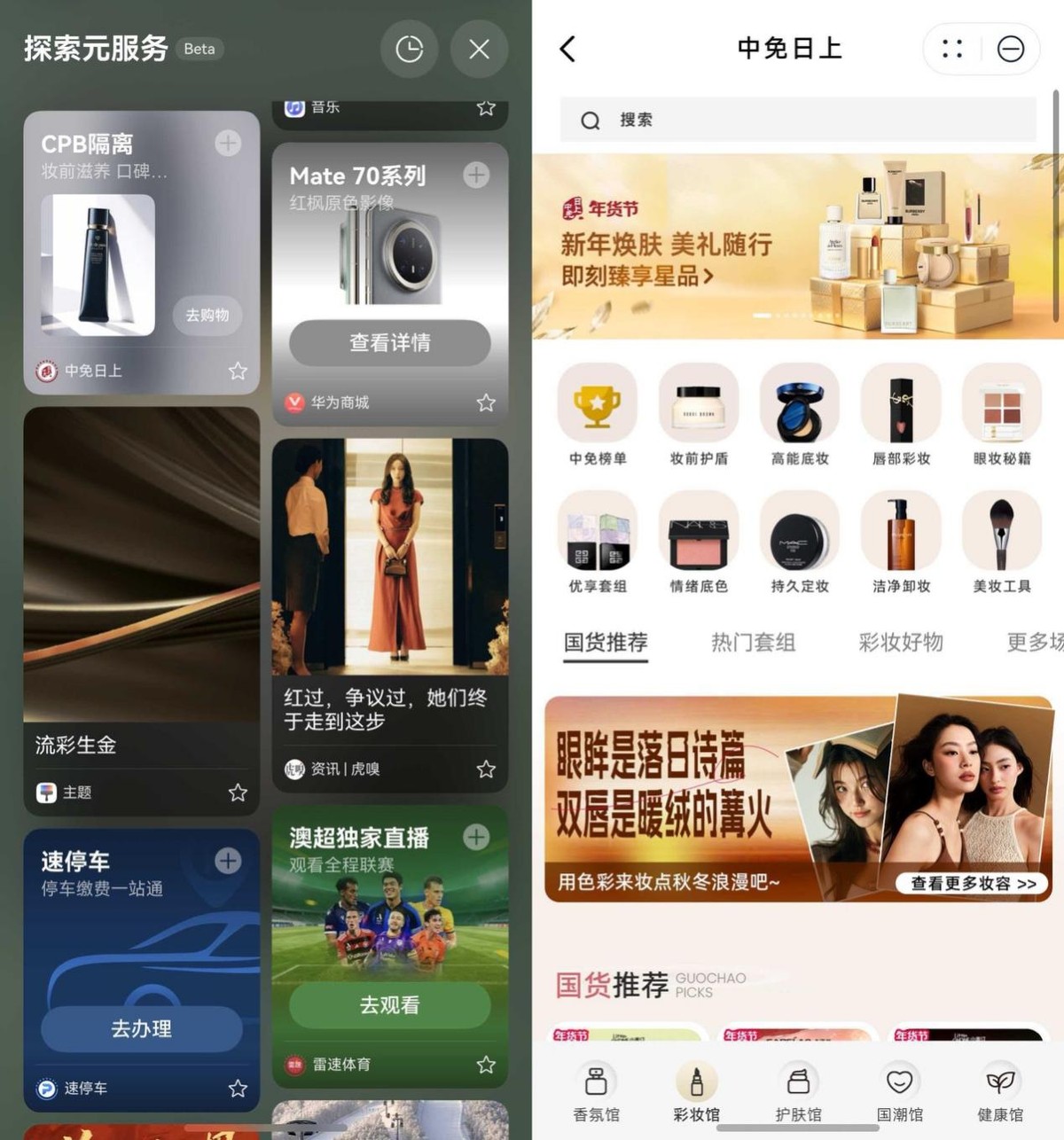 看了会儿文章,想换个轻松模式。划着划着刷到中免日上的卡片,正在推荐CPB隔离霜,想起朋友一直念叨想买,就点进去帮她看了看。帮她看完美妆,系统仿佛猜到了我想要放松一下,紧接着我就刷到了一个短剧元服务卡片。不得不说,现在的短剧剧情是真的会玩,不仅节奏快,梗还新,越看越上瘾。