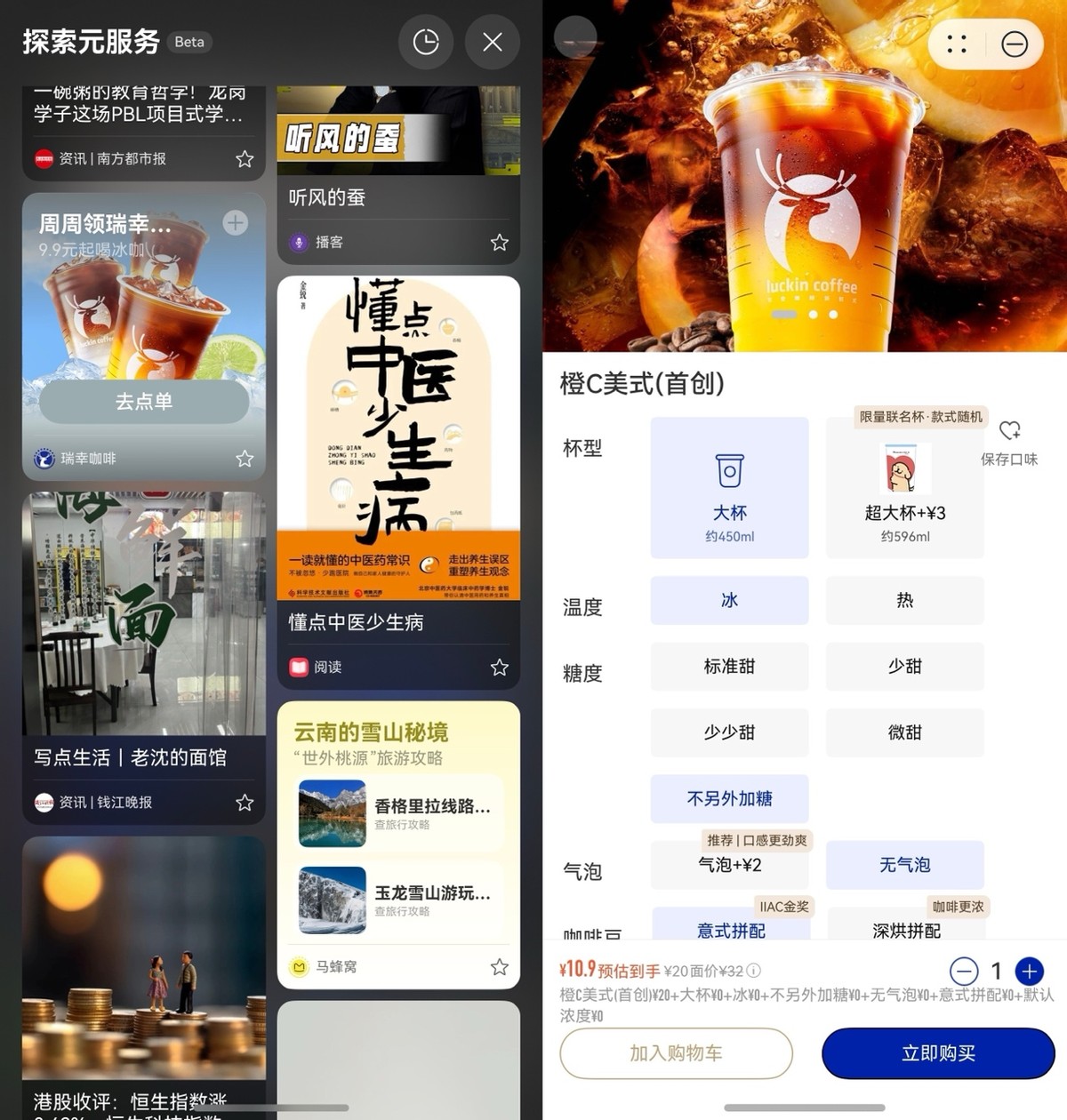 早上提前赶到高铁站,候车时想着看看探索元服务能给我些什么灵感,于是桌面右滑进入负一屏,划到底部再上划一下,进入“探索元服务”刷刷资讯,正好给我推了瑞幸咖啡的卡片,想着车上可以喝一杯解困,就点进去选了我常喝的橙C美式。点选、下单、支付,在瑞幸咖啡元服务里一气呵成。五分钟后,我就取到了咖啡继续候车,那一瞬间我觉得,这“探索元服务”有点东西啊。
