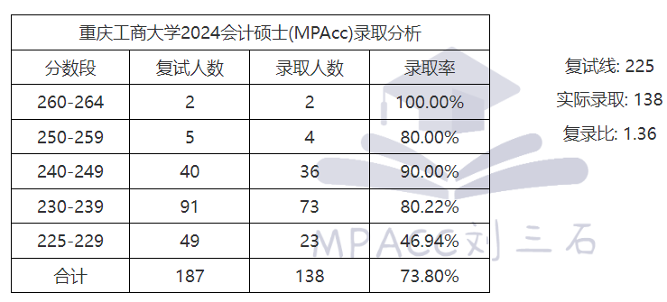重庆工商会计专硕24年分数线下降3分达到225,降幅略微小于预期,23年的涨幅太大,这样的降幅还不太够,招生人数变动不大,复录比也基本持平,维持在1.35左右,算是比较低,刷人集中在压线5分以内,相较于23年报考难度小幅度下降。
