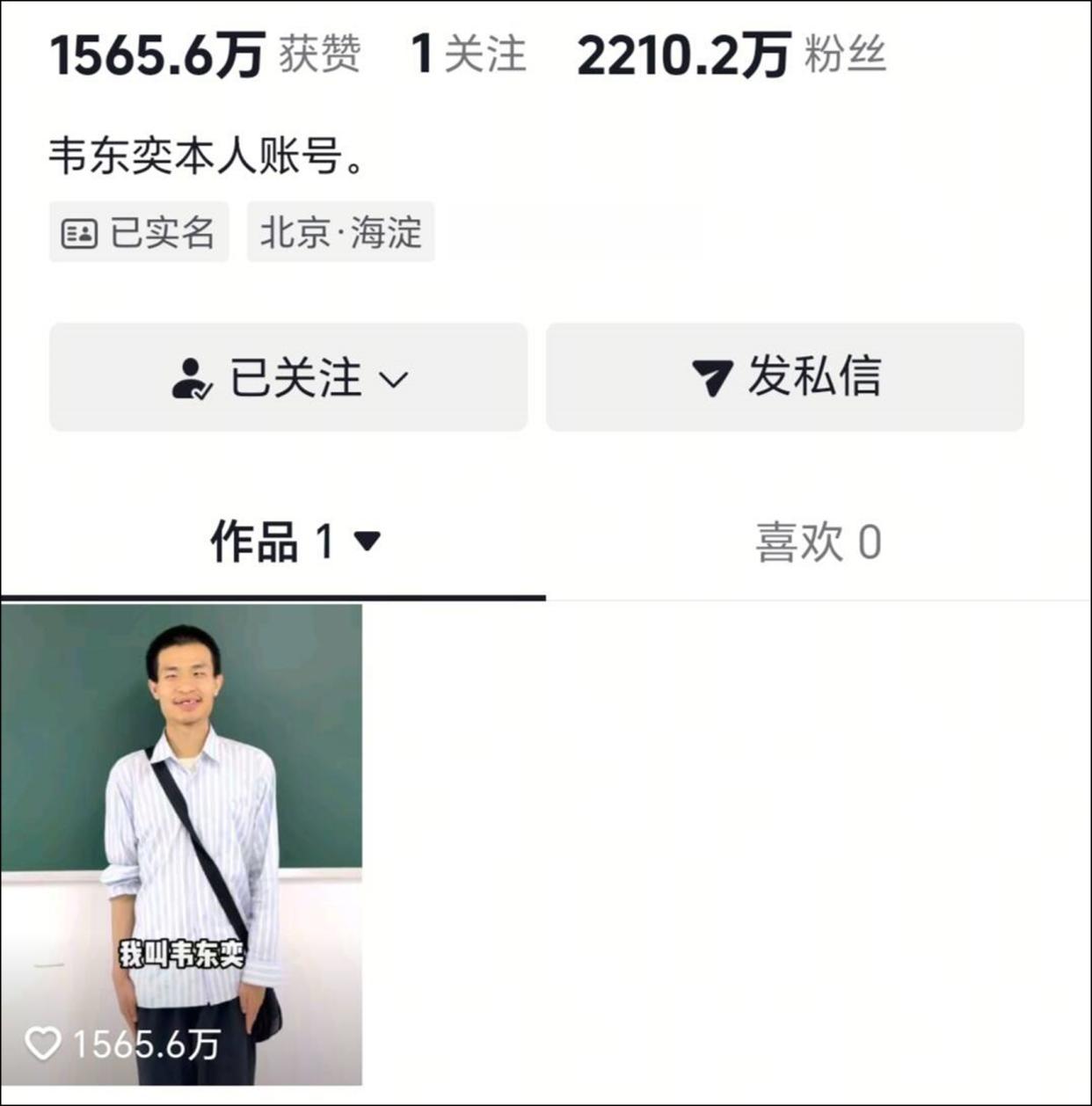 然而就是这么几秒钟的视频,却创下了平台涨粉数量的记录,这条短视频点赞量超过1500万,韦东奕也借此涨粉2000多万,一跃成为顶流。