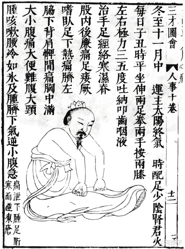 陈抟老祖的冬至导引术,每日在子丑时段,平坐,伸开两足,两手握拳,按住两膝,左右用力抻拉15次,然后叩齿,吐纳,漱咽。