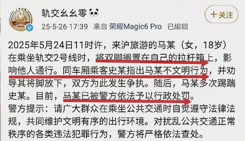 马某把脚架在行李箱上,说白了就是觉得“我花钱买票,地盘就是我的”。可地铁是公共空间,你伸腿舒服了,别人就得侧着身子过。想起咱们坐公交时,要是有年轻人占着老弱病残座,司机喊一句“给老人让个座”,大部分人都会不好意思地站起来。为啥?因为知道公共场合得替别人着想。可现在有些年轻人,把“个性”当借口,把没礼貌当“自由”,你跟她讲规矩,她跟你耍脾气。