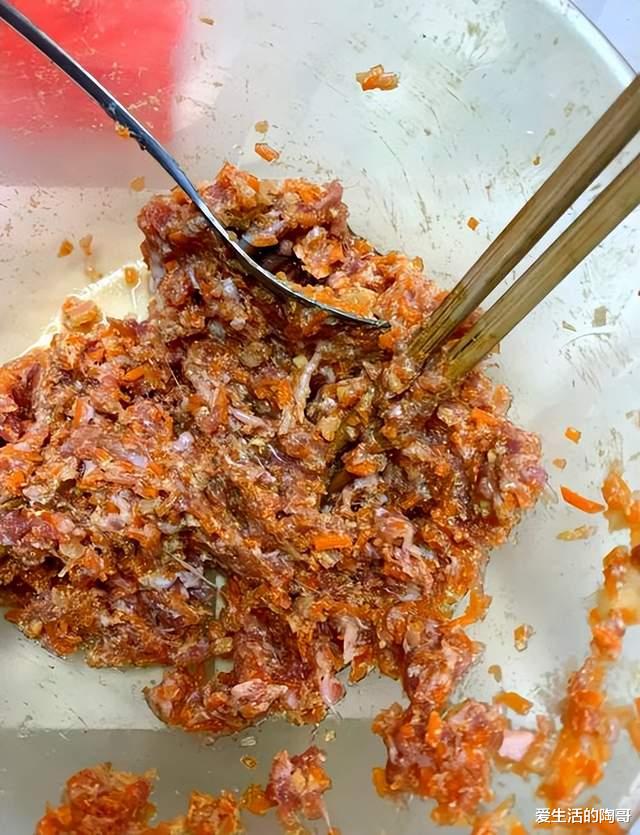 4然后把胡萝卜末与羊肉末放一起,加入一点香油反复搅拌,菜馅混合匀了,就做好了。这样的馅煮出来,满口鲜香,很多汁。