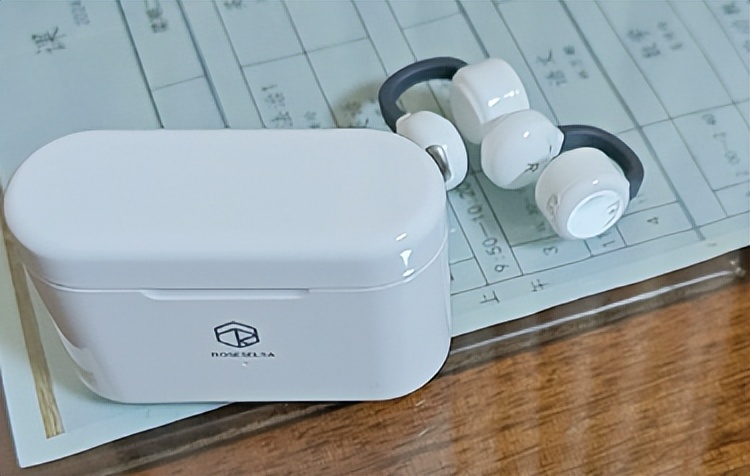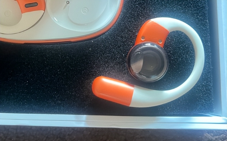 佩戴上,单耳9.5克不算轻,但是0.7毫米钛合金耳挂是做了扁平化处理的,韧性很好可以随便弯。耳挂是液态硅胶的材质,亲肤不闷汗,运动戴着也很舒服。充电壳是磨砂材质的,不留指纹,质感拉满。