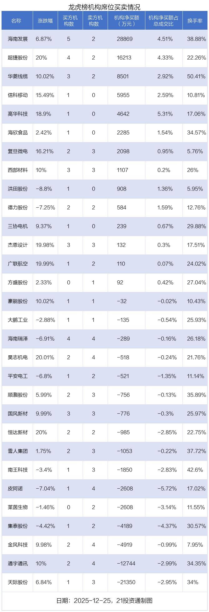 其中,机构净买入金额最多的是海南发展(002163.SZ),当日收盘上涨6.87%,换手率为38.88%。