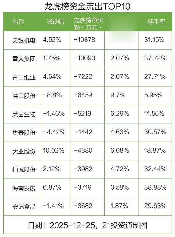 而龙虎榜中资金净流出最多的是天银机电(300342.SZ),被净卖出为1.04亿元,占总成交金额的2.48%。天银机电收盘上涨4.52%,换手率为31.15%。