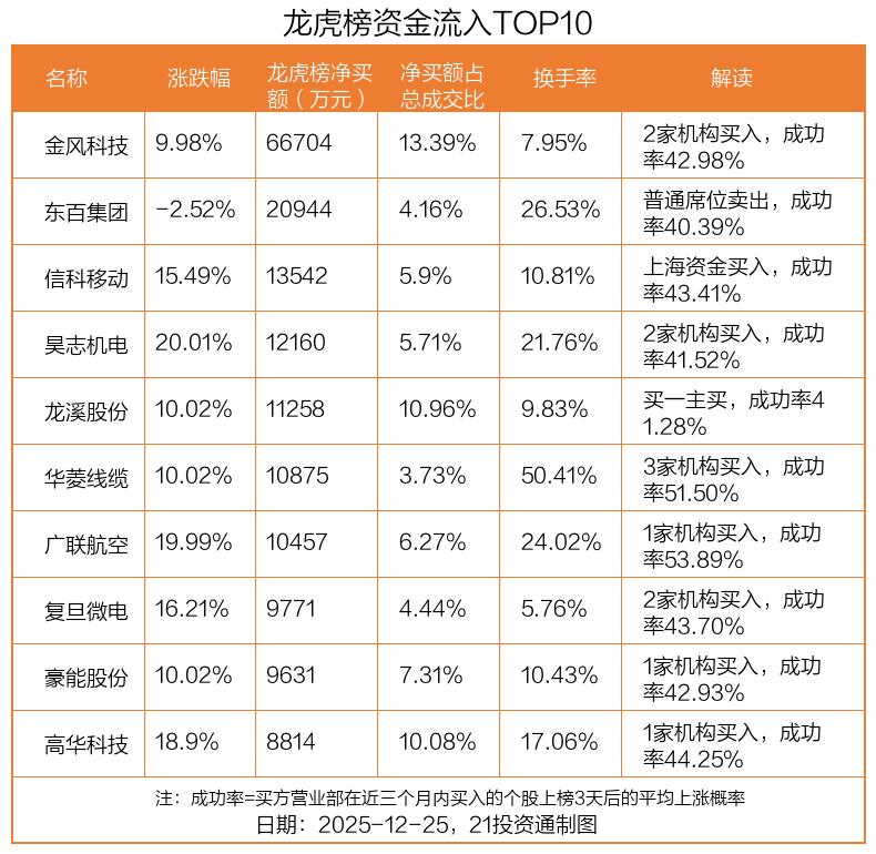 12月25日,上证指数上涨0.47%,深证成指上涨0.33%,创业板指上涨0.3%。盘后龙虎榜数据显示,共有46只个股因当日异动登上龙虎榜,资金净流入最多的是金风科技(002202.SZ),达6.67亿元。
