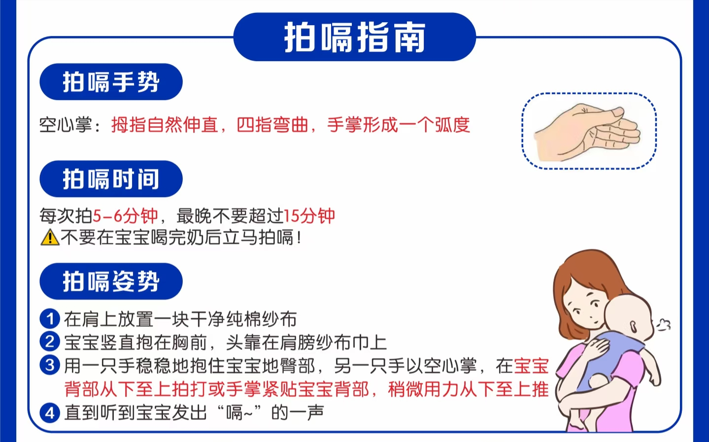 - 竖抱拍嗝法: