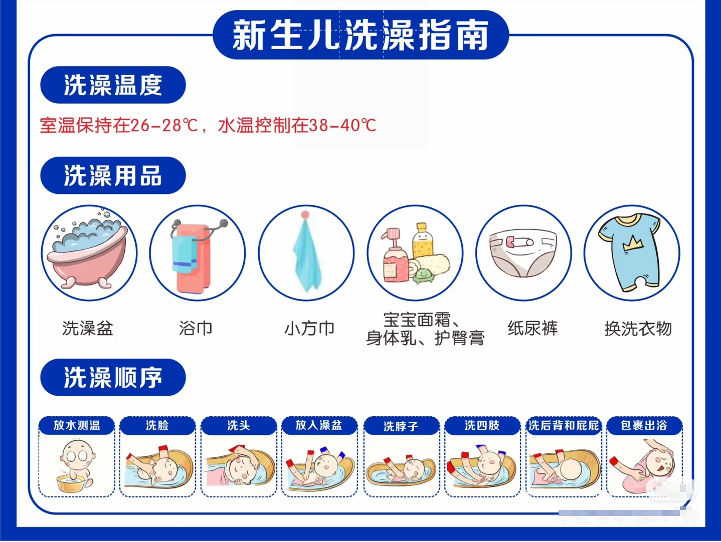 3. 全程5-10分钟,脐带未脱落时用海绵擦浴