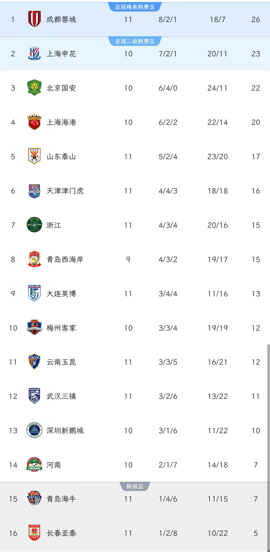 争冠五强里,蓉城、申花、国安、海港全部积分20分及以上,山东泰山17分已经掉队。中游三队是津门虎、浙江、西海岸,而保级大军里,河南、海牛、亚泰三队紧咬,深圳、三镇、玉昆、梅州、英博有着积分优势。