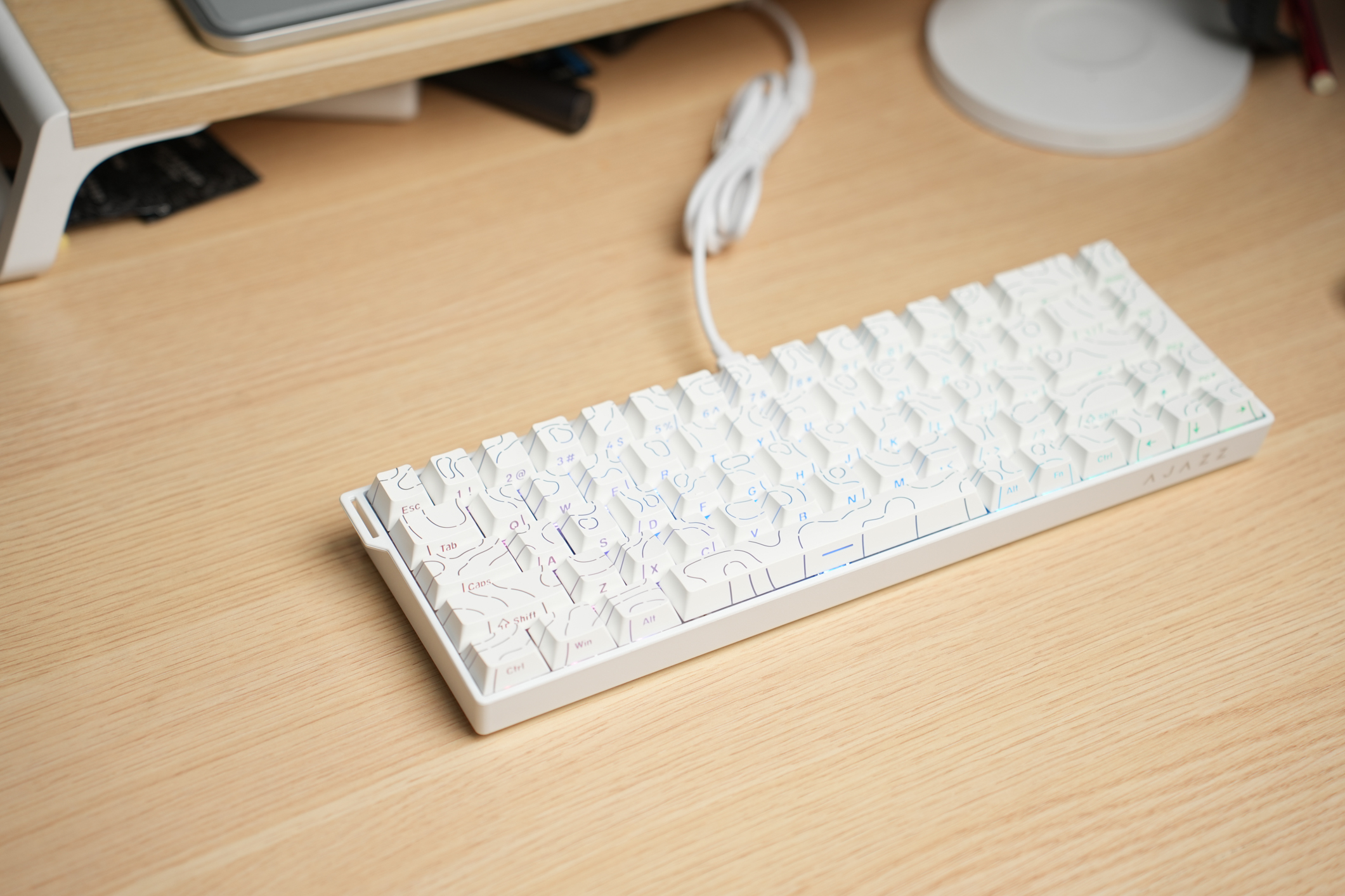 颜值即正义,等高线设计惊艳桌搭。这款等高线白配色堪称桌面百搭款,纯净的白色基调搭配侧刻字符,既避免了正面印字的突兀,又能让灯光均匀透出,电竞感拉满。键帽采用PBT双色注塑工艺,磨砂触感细腻,上手冰凉顺滑,关键是耐磨不打油,长期使用依然清爽如初。