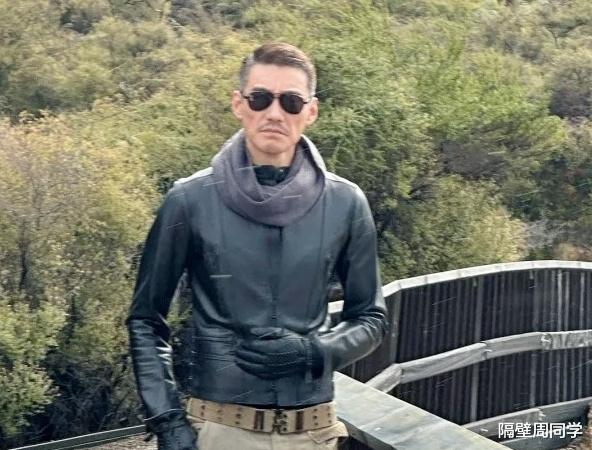 当时的胡兵穿着皮衣,戴着围巾墨镜,下身的裤子非常奇特,不愧是模特出身,穿搭打扮尽显时尚。