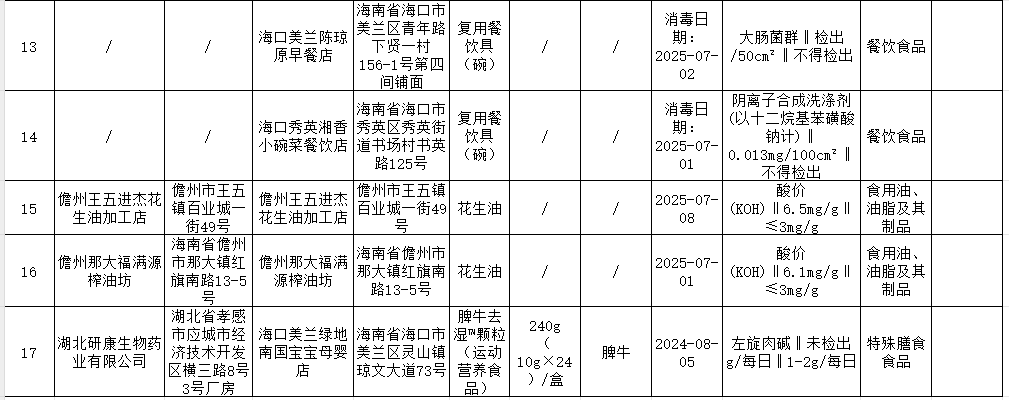 近期,海南省市场监督管理局组织食品安全监督抽检1379批次,检出17批次样品不合格。