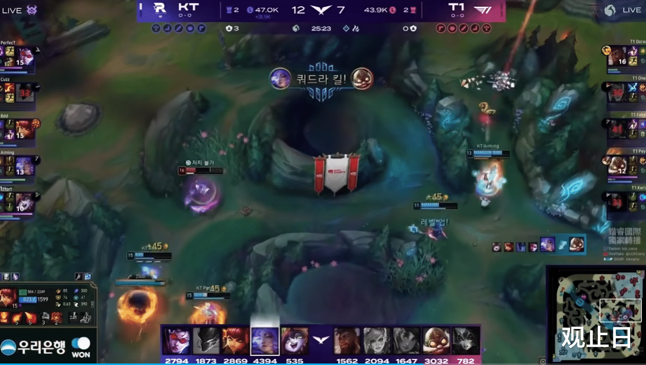 25分钟龙魂团,Aiming芸阿娜砍下四杀,KT团灭T1并拿下大龙。最后一波,KT打出0换4结束比赛,T1首秀0-2惨败。