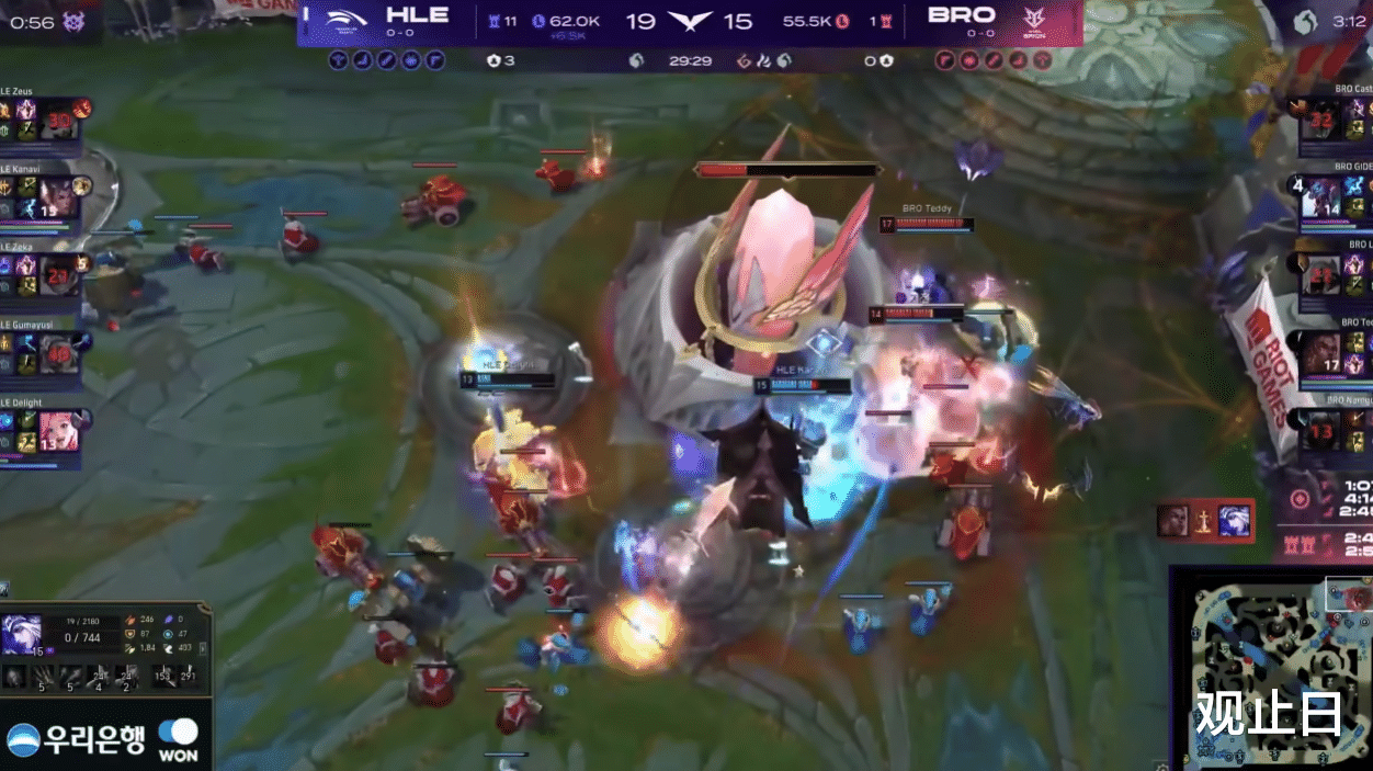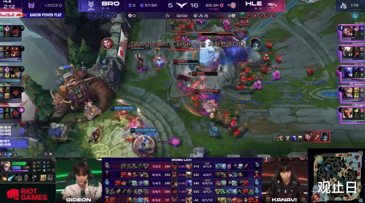 第一局:Zeus杰斯大优势带队滚雪球,Kanavi潘森虽然送了一波,但HLE稳扎稳打破三路拿大龙,32分钟拿下。